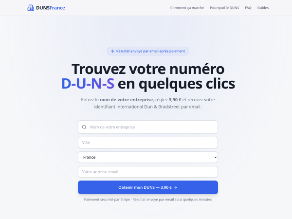 Recherche automatique de numero D-U-N-S pour entreprises francaises — paiement Stripe, resultat par email